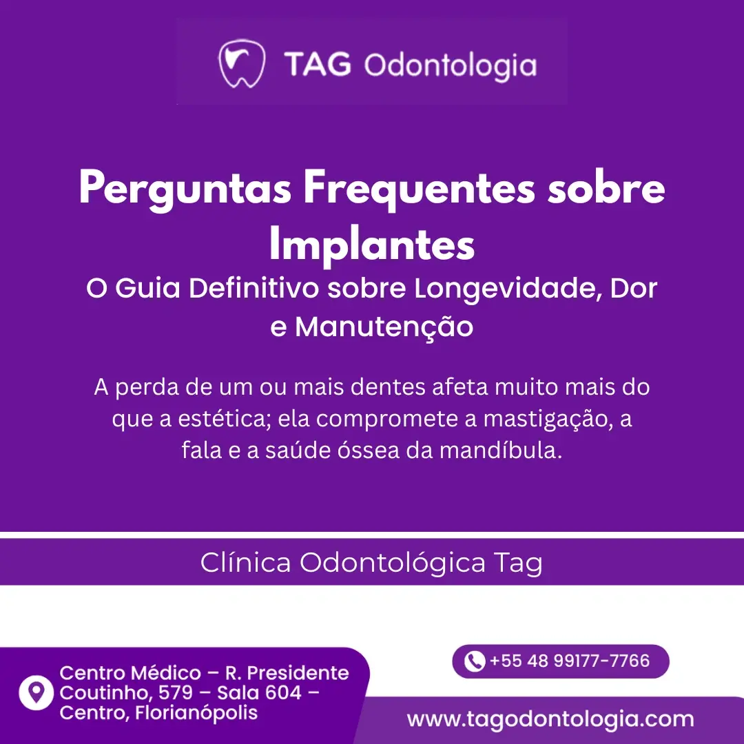 No entanto, antes de iniciar o tratamento, é natural ter dúvidas. Na Clínica Odontológica TAG em Florianópolis, nossa missão é fornecer clareza e segurança. Compilamos as perguntas mais frequentes para desmistificar o processo e mostrar por que somos a melhor escolha de Dentista Florianópolis para a sua implantodontia.